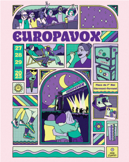 Pour l’affiche, le style est grandement inspiré de celui de Rick et Morty, mais également de l’affiche Europavox 2025 qui reprend cette idée de l’arche. Enfin j’ai pioché dans mon carnet de dessin pour le troisième élément de l’affiche : une sortie de cadre pour donner une impression de perspective.