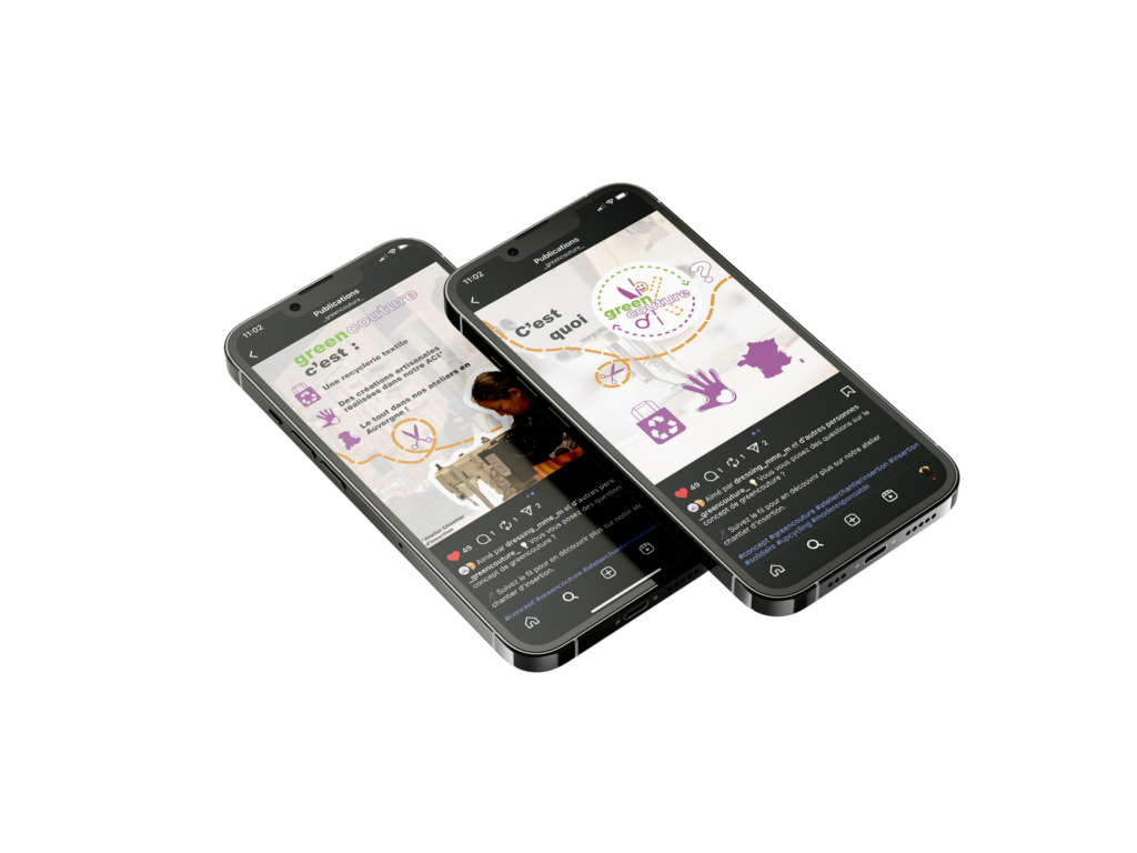Lors de mon stage chez l’atelier chantier d’insertion et association greencouture, Carole, directrice et fondatrice de l’ACI, m’avait évoqué le besoin de recréer des posts épinglés pour leur Instagram. Elle m’avait demandé de bien respecter la charte graphique de greencouture, et d’avoir une certaine cohérence avec les précédents post.
